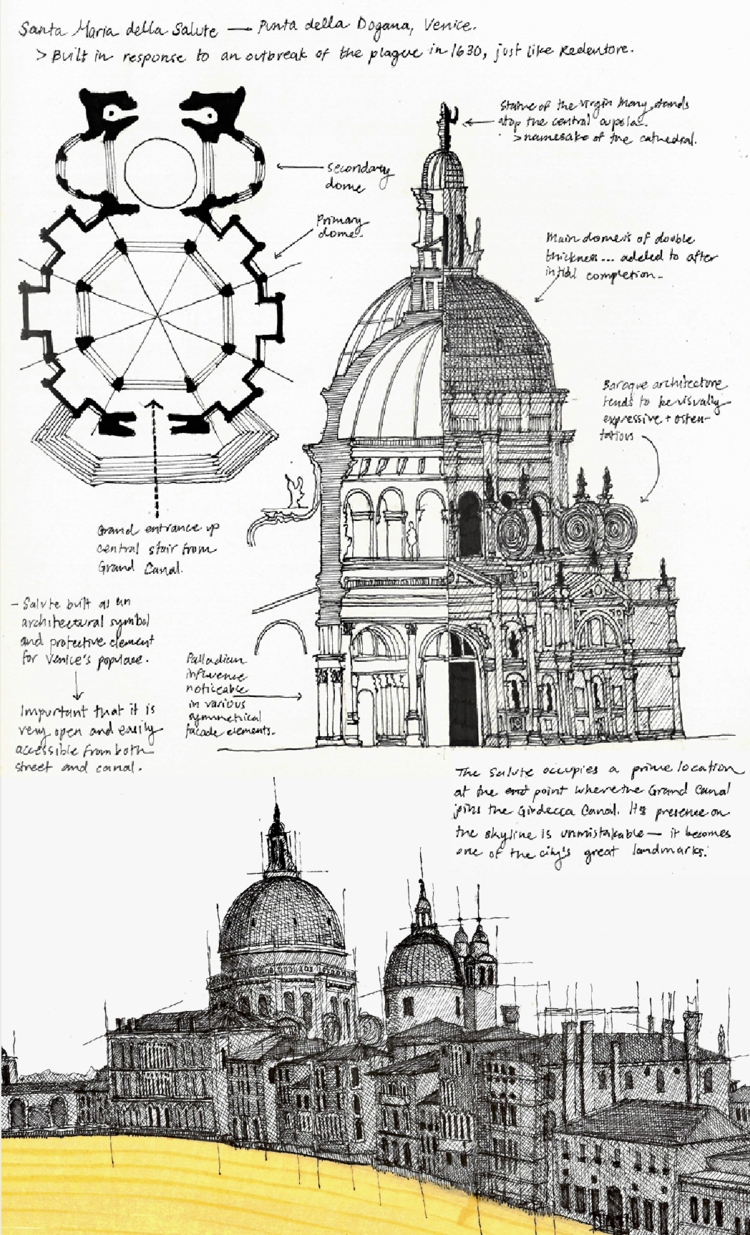 Free-hand ink sketches of buildings and urban spaces, completed in-situ in various cities.